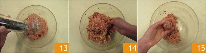 Season with salt and pepper 13 and knead again until you get a homogeneous mixture 14, it will take at least 5 minutes. Now cover with a plate and place in the fridge for 15 minutes. After the resting time, you can form the meatballs. For each, you will need about 1 oz of mixture and you should give them a spherical shape, by rolling the mixture between your hands 15.