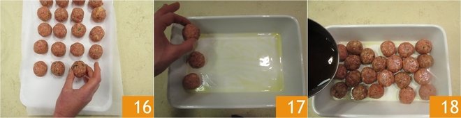 Arrange them on a tray as you go 16, you will get 30. Now grease a baking dish and place the meatballs inside 17, then pour in the warm broth 18.