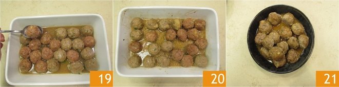 Bake in a preheated conventional oven at 355°F for 15 minutes, then take out the meatballs and turn them 19. Bake for another 15 minutes at the same temperature with the convection mode. Take out 20 and serve your hot meatballs with the cooking sauce 21.