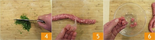 In the meantime, finely chop the garlic and parsley 4. Now take the sausage, cut the casing and remove it 5. Then transfer the sausage meat into a bowl, crumbling it with your hands 6.