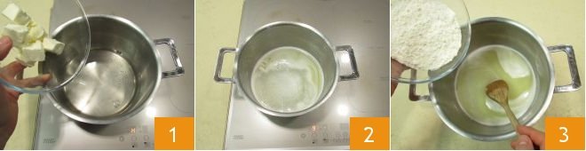 To prepare the baked zeppole di San Giuseppe start making the choux pastry. Place the water and the cubed butter in a pot 1, then let it melt over moderate heat 2; as soon as it starts to boil add the flour all at once 3.
