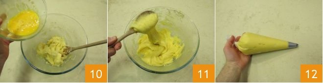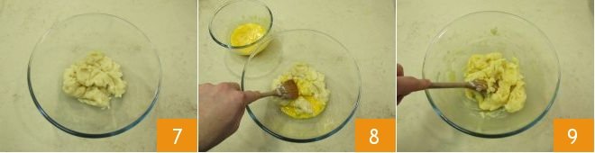 Transfer to a bowl 7 and let it cool. Meanwhile, beat the eggs in a bowl, then add a little to the now lukewarm mixture and mix with a wooden spoon 8 until fully incorporated 9.