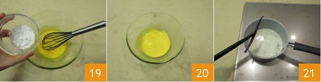 In a small pot combine the milk, cream 16, the seeds you have scraped from the half vanilla pod, and also the emptied pod 17. Bring the mixture to just below boiling, meanwhile in another bowl combine the yolks with the sugar 18 and beat quickly with a whisk.