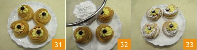 At this point 31, dust with plenty of powdered sugar 32: your baked zeppole are ready to be served 33!