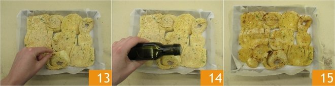 Now place it in the bowl with the breadcrumbs 10 and turn it over to coat it on both sides 11. Place the slice on an oven tray covered with parchment paper 12.