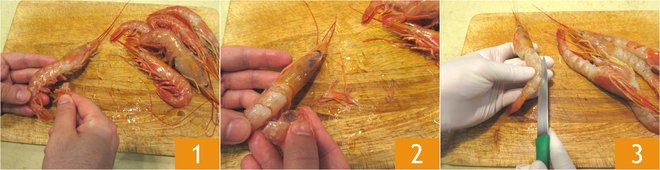 To prepare the baked prawns, start by cleaning the prawns: remove the prawn legs 1, remove the shell, taking care not to remove the head or tail, which should be left attached to the prawn for decoration. Now cut the back of the prawn with a small knife 3.