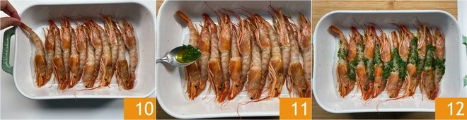 Take a rectangular baking dish, place the cleaned prawns close together, side by side 10, and drizzle them with the citronette, pouring it directly over the shellfish flesh 11 12.