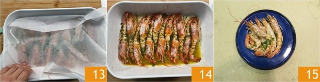 Cover the prawns with a sheet of parchment paper, which will help retain moisture inside, so the prawns will remain tender 13. Bake in a preheated static oven at 392°F for 10-12 minutes. When cooked, take your baked prawns out of the oven 14 and serve them hot 15!