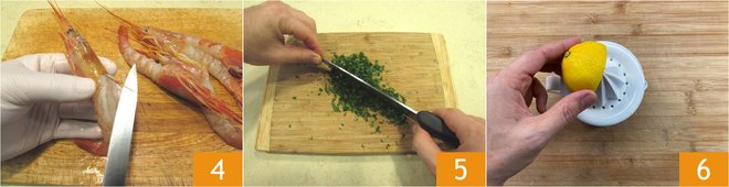 Remove the dark filament, the prawn's intestine, by gently pulling it out with the knife blade or a toothpick 4. Wash the parsley, dry it, and chop it very finely 5. Squeeze the lemon juice 6.