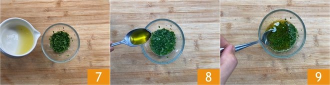 Then prepare the citronette that will be used to flavor the baked prawns: put the parsley in a small bowl, pour in the lemon juice 7, the olive oil 8, and finally season with salt and pepper to taste. Mix the sauce well 9 and set aside.