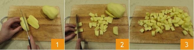 To prepare the baked sausage and potatoes, start with the potatoes. First peel the potatoes, then cut into slices 1 and then into cubes, making sure they’re all the same size (2-3).