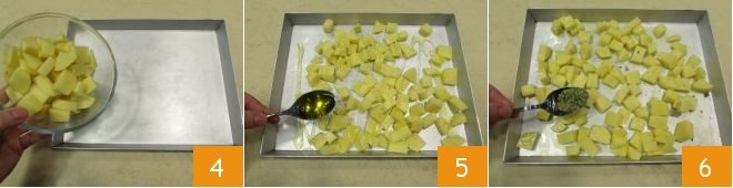 Transfer them to a baking sheet 4 and season with salt, pepper, oil 5, and oregano 6. Mix the potatoes to ensure they’re uniformly seasoned.
