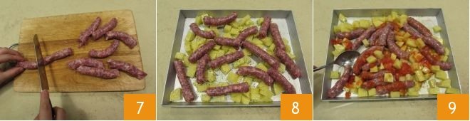 Now cut the sausages into pieces about 2-3 inches (6-7 cm) long 7 and arrange them on top of the potatoes 8. Mash the peeled tomatoes in a small bowl and pour them onto the baking sheet, mixing everything together 9.