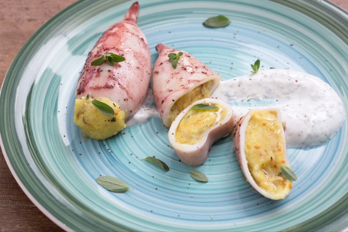 Totani, or European squid, are sometimes considered the poor man’s calamari, and the two are, in fact, often confused, but we know exactly how they differ in terms of shape and color, among other things. When it comes to using them for cooking, however, the two are pretty much interchangeable. So, following on from our delicious stuffed calamari recipe, we thought we’d put together a recipe for stuffing their marine cousins, too, giving us today’s recipe for totani ripieni – baked stuffed squid. An appetizing combination of potatoes, soaked bread, and fresh turmeric makes the perfect hearty, soft filling for the squid, accompanied by the freshness of a yogurt cream to give this fish main course that extra dimension!