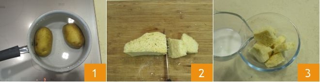 To prepare the stuffed squid, start with the potatoes. Place them in a saucepan with cold water and cook for around 20-30 minutes from boiling (you can speed up the cooking process by using a pressure cooker)1. Once they’re ready (make sure they can be pierced easily with a fork), allow them to cool, then peel and set aside. Next, remove the crust from the bread, cut the bread into chunks 2, and soak the chunks in the milk 3.