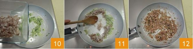 Then add the chopped wings and tentacles 10 and cook over high heat for a few moments 11, ensuring that the water released from the squid evaporates completely 12.