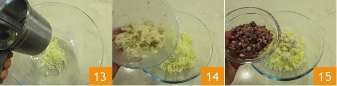 At this point, you need to start preparing the filling. Mash the now-cold potatoes in a large bowl 13 and add the soaked bread 14, the chopped squid and scallion 15,