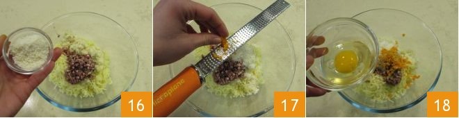 the grated Parmigiano Reggiano cheese 16, the peeled fresh turmeric grating it directly into the bowl 17, the salt, the pepper, and the whole egg 18.