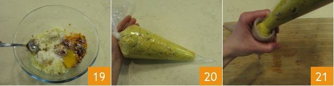 Mix thoroughly 19, and once all of the ingredients are combined, transfer the mixture to a disposable pastry bag 20. Preheat a conventional oven to 350°F (180°C), then grease the bottom of a small baking dish (that will hold 4 stuffed squid), stuff the squid to the top with the filling 21,