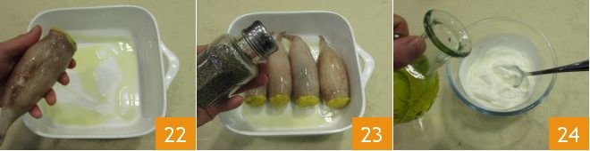 and lay them side by side in the dish 22. Season with salt and pepper to taste 23 and finish with a drizzle of oil. Bake in a conventional oven preheated to 350°F (180°C) for approximately 30 minutes. While the squid are baking, turn your attention to the accompanying sauce. Pour the yogurt and cream into a small bowl, add a drizzle of oil 24