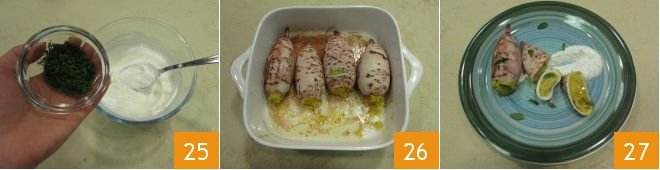 and the dill 25, and mix well. Once the squid are cooked, take them out of the oven 26 and serve each baked stuffed squid with the accompanying sauce 27.