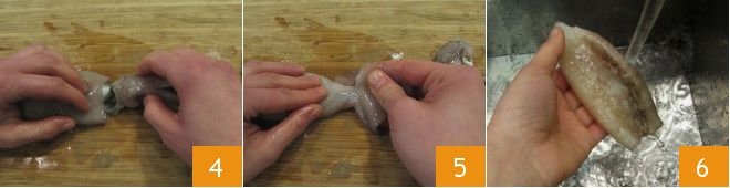 Clean the squid by removing the head (4-5) and the side “wings” with a knife. Rinse the squid thoroughly, both outside and inside 6, to remove any impurities.