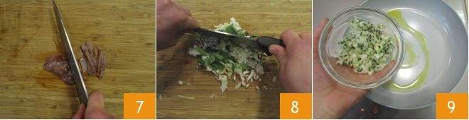 Chop up the wings and the tentacles 7, and finely chop the scallion, having removed the green part and the roots beforehand, along with the marjoram leaves 8. Heat the extra virgin olive oil in a pan, add the chopped scallion and marjoram 9, and fry over low heat, stirring occasionally, for a few minutes.