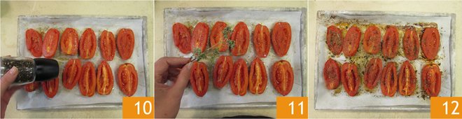 Sprinkle with salt 7 and bake in an oven preheated to 355°F (180°C) for 20 minutes. Remove the tomatoes from the oven 8 and turn them over one by one 9.