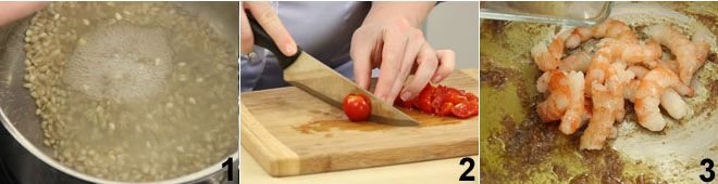 To prepare the barley salad with anchovies, shrimp, and cherry tomatoes, start by boiling the barley in 1.5 quarts of boiling water 1. Meanwhile, wash the cherry tomatoes and cut them into quarters 2, then melt the anchovies in the oil over the heat for a few moments; add the shrimp and sear them for a few seconds 3.