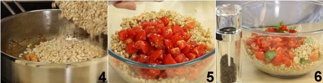 Remove everything from the heat, let it cool, then add the cherry tomatoes 5 and the basil leaves torn by hand 6; add another dash of raw oil, pepper to taste, and mix well. Let it rest and cool completely, then place the barley salad with anchovies, shrimp, and cherry tomatoes in the refrigerator for at least an hour.