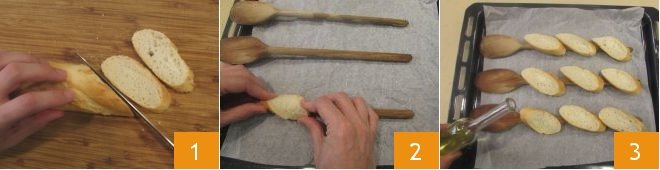 To prepare the beef tartare on bruschetta, start with the latter: cut the baguette into oblique slices of 1/4 inch 1; then line a baking sheet with parchment paper and place 3 wooden spoons on it. The handles of the spoons will serve to give a boat shape to your bread slices. Place the slices, one by one, and press them without breaking to shape them 2. Instead of spoons, you can use cannoli molds if you have them. Season the bread slices with olive oil 3