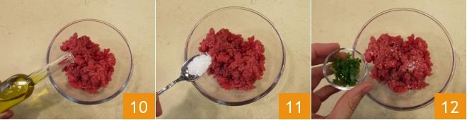 Transfer the meat to a bowl, season with olive oil 10, salt flakes 11, a grind of black pepper, and chopped chives 12. Mix and set aside for a moment.