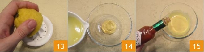 Now, prepare the accompanying sauce: squeeze the lemon juice 13. In a small bowl, pour the mustard, add the lemon juice 14, and season with a few drops of Tabasco 15.