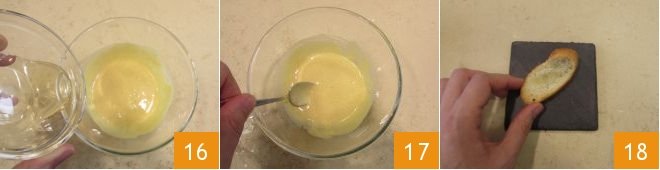 Finally, add the acacia honey 16 and emulsify everything with a teaspoon 17. Assemble the tartare on bruschetta: place the toasted bread slices on a serving plate with the concave side up 18,