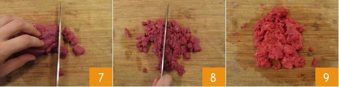 and then into cubes 7. Finely chop the beef cubes with a knife on the cutting board 8 until you get a soft and creamy consistency 9.