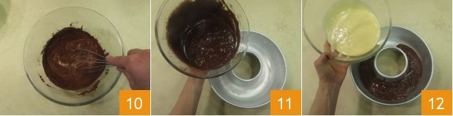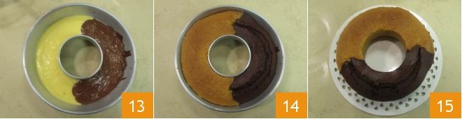Your cake is ready to be baked 13 in a static oven preheated to 350°F for around 40 minutes 14. After checking the bicolor ring cake is done by using the toothpick test, leave it to cool until warm before removing from the mold and serving 15!