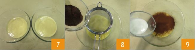 Once you have stirred the powders into the mixture, switch the whisk off and place half of the batter in another bowl 7. Sieve the cocoa and add it to one of the bowls 8, then add the cream 9