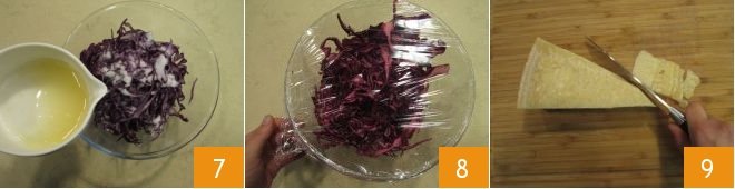 a pinch of black pepper and the juice of 1/2 lemon 7. Mix well and cover with plastic wrap. Let it marinate in the refrigerator for about 2 hours 8; this process will allow the cabbage to soften and sweeten in flavor. Then, cut the piece of Parmigiano and reduce it into coarse shavings 9.