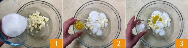 To make the blackberry tart with white chocolate ganache, start with the shortcrust pastry: in a bowl, mix the butter, sugar 1, lemon zest 2, and salt 3, then work with your hands until the sugar is absorbed.