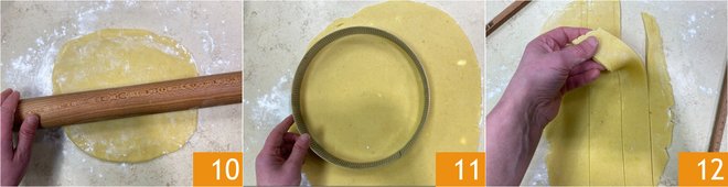 After the resting time, lightly flour the pastry and roll it out to a thickness of 1/8 inch 10. Cut out a disc with a diameter of 9 1/2 inches 11 and strips with a width of 1 1/4 inches 12.