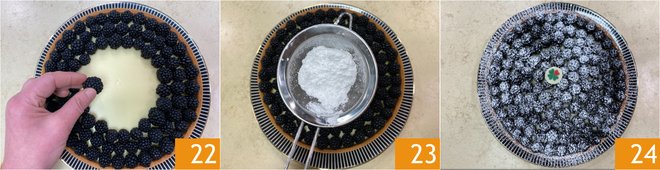 After the setting time, decorate the tart by arranging the fresh blackberries in concentric circles to cover the entire ganache 22, then sprinkle with powdered sugar 23. Your blackberry tart with white chocolate ganache is ready to be served 24!