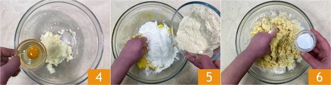 At this point, add the egg 4 and mix again to combine. Add the all-purpose flour and almond flour 5 and continue to mix, then add the baking powder 6.