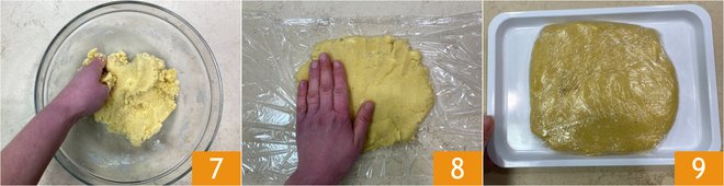 Mix in the bowl to incorporate the dry ingredients evenly 7, then transfer the mixture onto a sheet of plastic wrap and flatten it to form a dough 8. Wrap the dough in plastic wrap and let it rest in the refrigerator for about an hour 9.