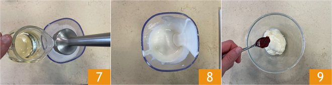 Start blending with an immersion blender, pouring the oil in a thin stream 7 until you achieve a mayonnaise-like consistency 8. Transfer the sauce to a piping bag and store in the fridge. Now move on to the chili sauce: in a bowl, combine the mayonnaise with the chili paste 9.