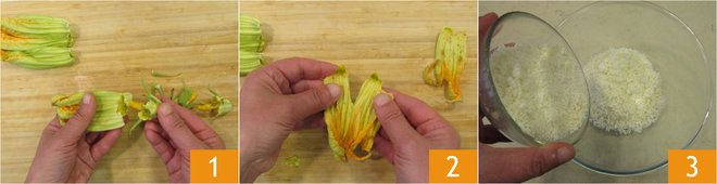 To make bucatini with pumpkin flowers, guanciale and saffron, remove the pistils from the pumpkin flowers 1 and cut them in three lengthwise 2; leave them whole if they are small. Leave the pumpkin flowers to one side and place the grated Parmigiano and Pecorino cheese in a bowl 3.