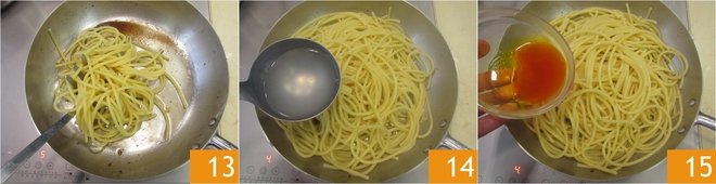 Drain the bucatini and add them to the pan with the guanciale fat 13, then add 2 ladles of the cooking water 14 and the saffron 15; stir thoroughly.