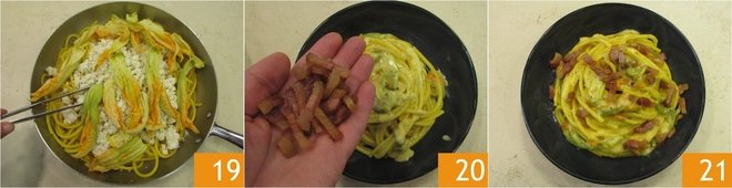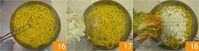 Cream the pasta by adding some more cooking water as needed, stirring all the while 16. Once cooked, remove from the heat and add the mixture of cheese 17, followed by the pumpkin flowers 18.