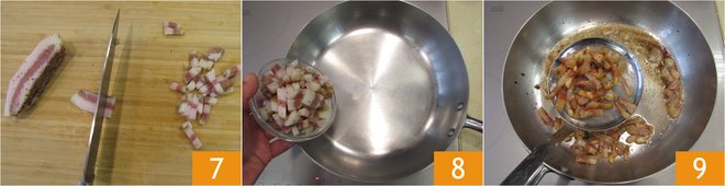 Now prepare the guanciale: remove the rind, cut into slices and then into strips 7. Place the jowl in a pan without adding any other fat 8 and brown until crispy and golden. Now remove the guanciale with a colander and leave the cooking sauce in the pan 9.