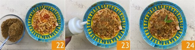Plate and garnish with plenty of muddica 22, then finish the dish with a drizzle of raw olive oil 23 and some fresh mint leaves: your busiate with tuna ragù is ready to be served 24!