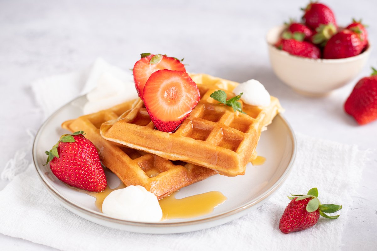 Waffles are a soft dessert that originated in North Europe. The honeycomb weave of this sweet street food makes it perfect for serving with toppings. Today we're going to show you how to prepare butter-free waffles, with an equally soft dough made with oil and greek yogurt, which are easy and quick to prepare. You'll need a waffle maker to make these classic sweets with square holes, before topping them with tempting creams, jams, syrups, or simply enjoying with some cream and strawberries, like we have done. You could also opt for a spreadable hazelnut or pistachio cream, or some greek yogurt. An excellent recipe for breakfast that you can share with all the family!